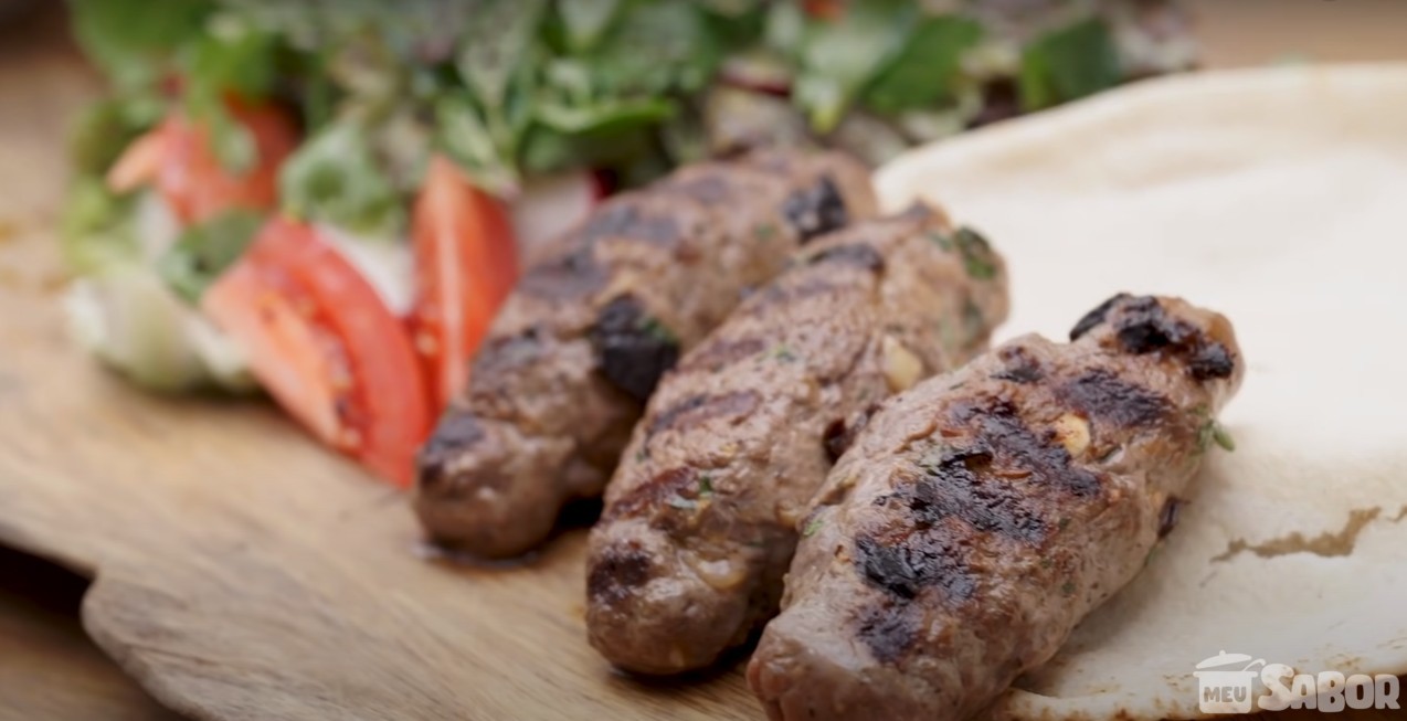 Carnes Kafta no espeto Ingredientes 1 kg de carne moída duas vezes (coxão mole ou duro) 3 colheres de sopa bem cheias de cebola